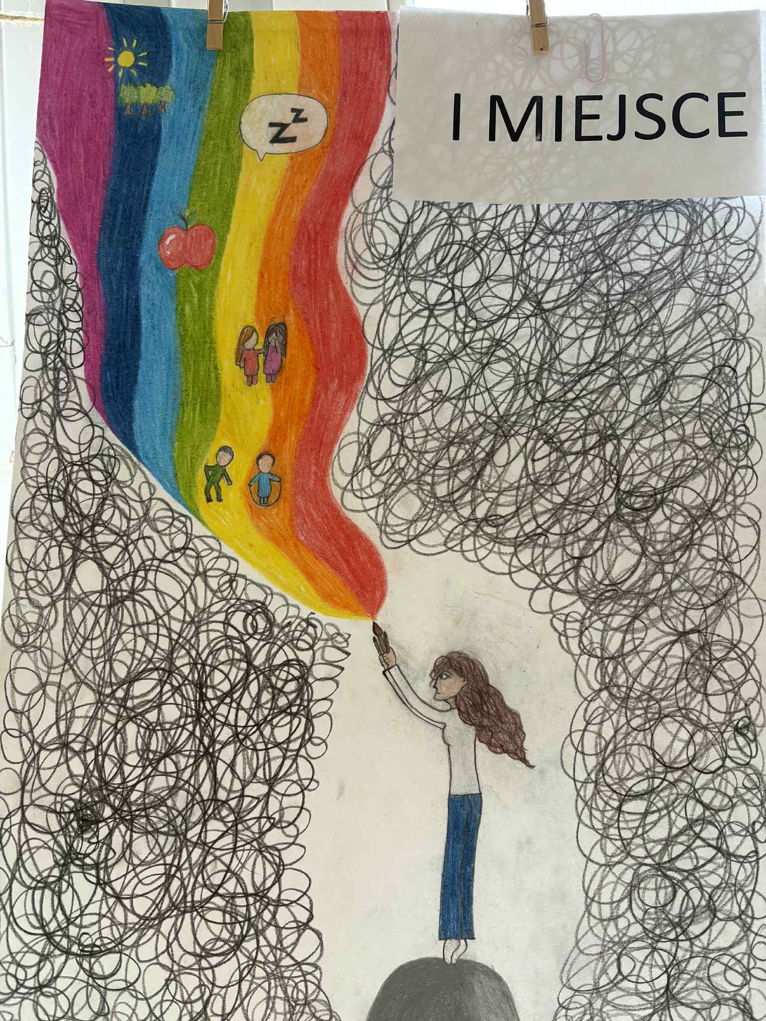 Z okazji obchodów Tygodnia Zdrowia Psychicznego w naszej szkole został zorganizowany konkurs plastyczny, którego celem było promowanie troski o zdrowie psychiczne, rozwijanie wrażliwości artystycznej oraz zachęcanie uczniów do refleksji nad znaczeniem emocji, relacji i dobrego samopoczucia.