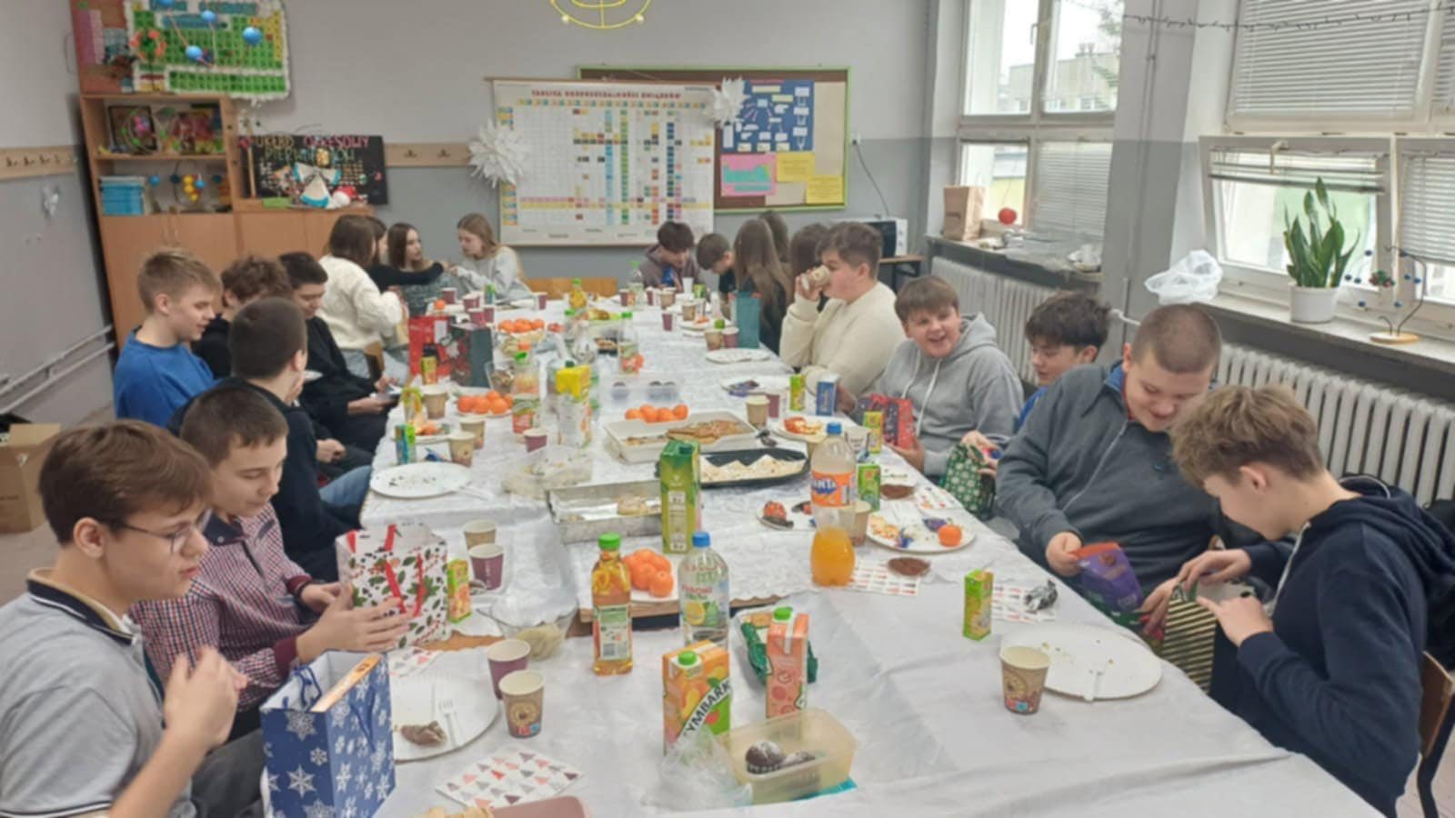 We wtorek uczniowie klasy 8c obchodzili swoją klasową Wigilię. Spotkanie odbyło się w świątecznej, miłej atmosferze. Było pyszne, tradycyjne jedzenie, dzielenie się opłatkiem oraz śpiewanie kolęd. Nie zabrakło też prezentów, które sprawiły wiele radości wszystkim uczestnikom. Ten wyjątkowy, wspólnie spędzony czas, pozwolił poczuć prawdziwą magię Świąt