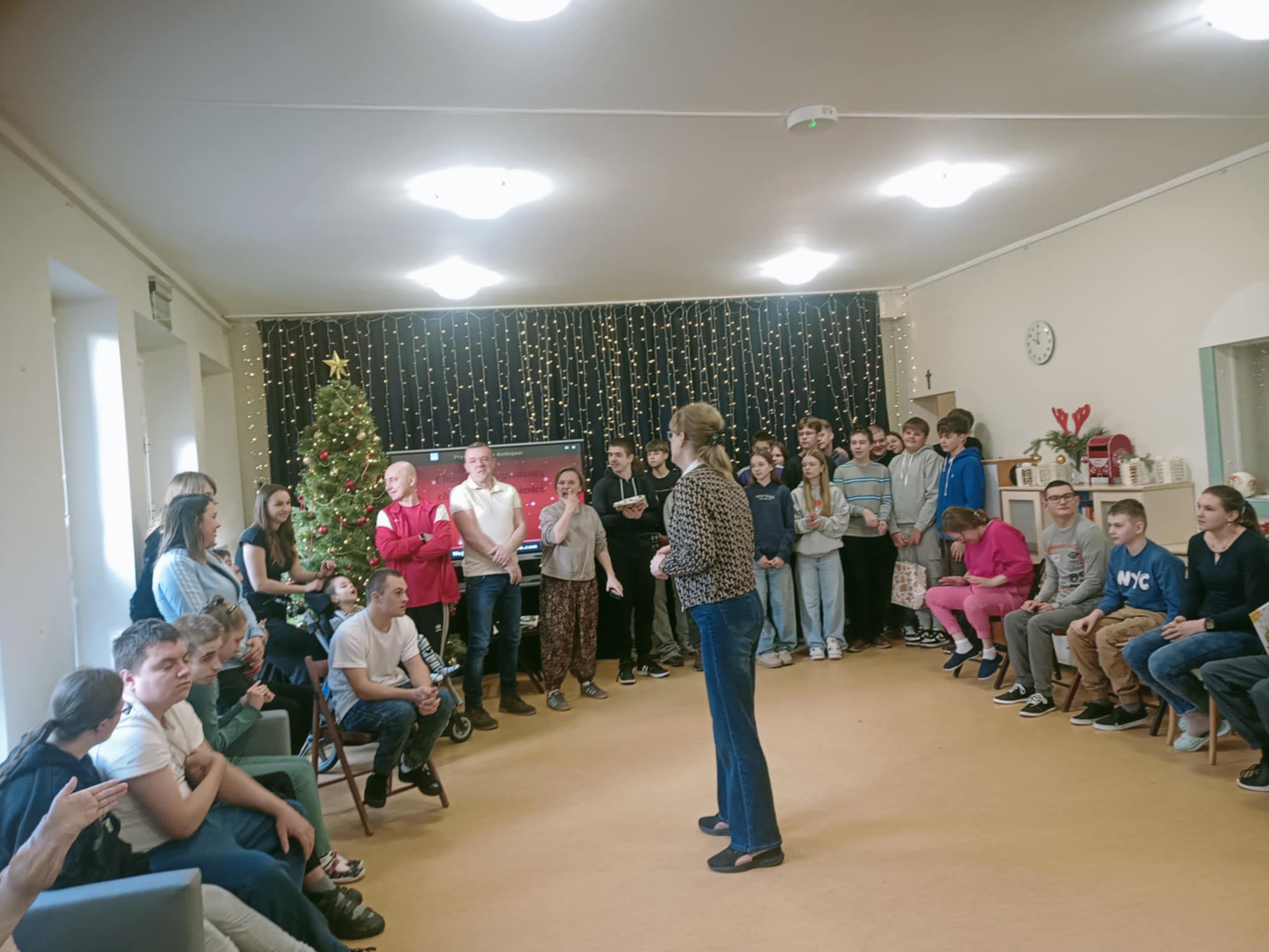 W dniu dzisiejszym uczniowie klasy 8c, w towarzystwie nauczycieli, złożyli wizytę w Ośrodku Rehabilitacyjno-Edukacyjno-Wychowawczym. Podczas spotkania przekazali świąteczne podarunki przygotowane specjalnie dla Piotra i Pawła, a wszystkim dzieciom podarowali cukierki. Uczniowie 8c również otrzymali słodkości od podopiecznych OREW, co stworzyło ciepłą i pełną wzajemnej życzliwości atmosferę. Wspólne kolędowanie stało się wzruszającym momentem, podkreślającym wyjątkowy charakter nadchodzących świąt!