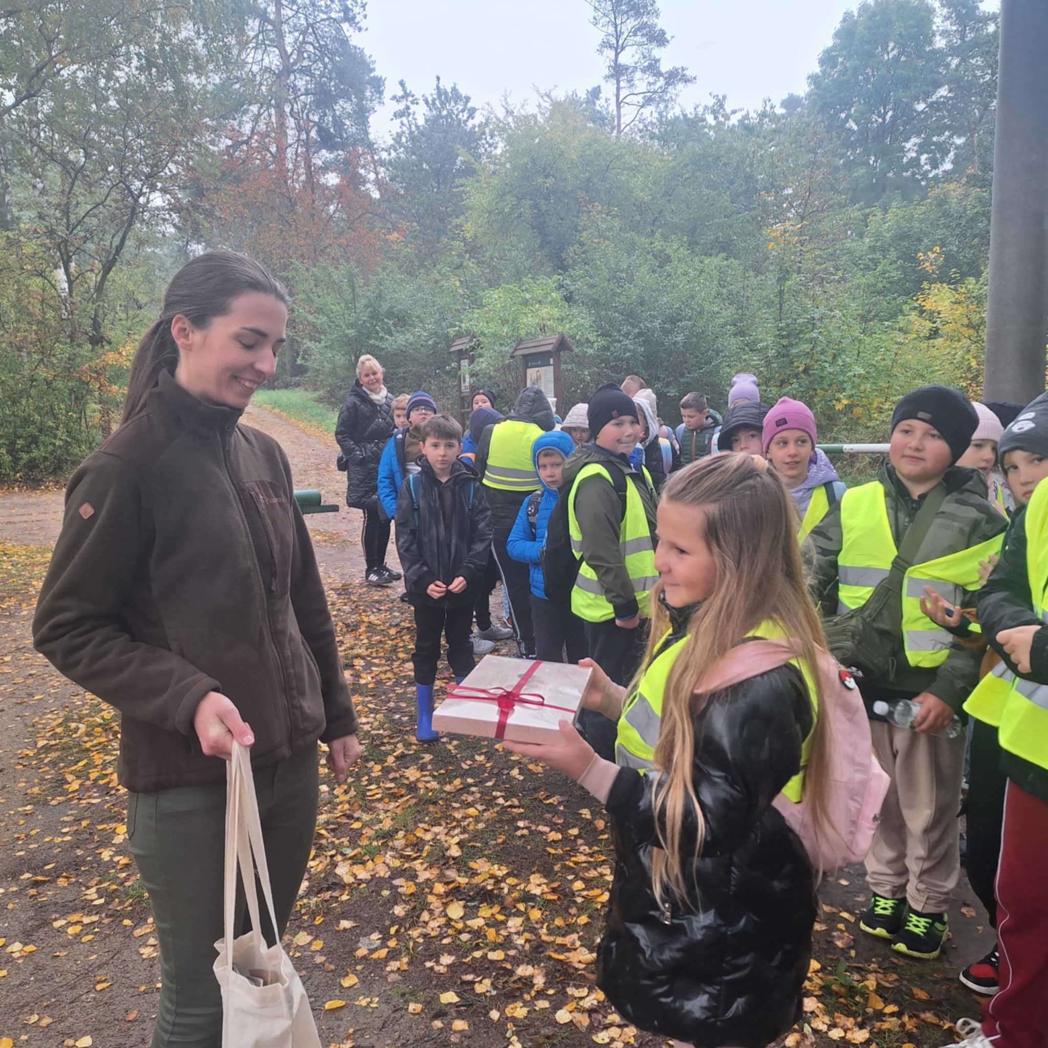 15 października uczniowie klas : 3a i 3d odwiedzili siedzibę Nadleśnictwa Konin - Lasy Państwowe. Podczas spaceru ścieżką edukacyjną przez las, pani leśniczy przekazała nam wiele ciekawostek o mijanych drzewach liściastych i iglastych. Przypomnieliśmy sobie wiadomości na temat piętrowej budowy lasu. Na koniec podziękowaliśmy " słodko " nie tylko za ciekawą lekcję przyrody, ale też za otrzymane książki i inne upominki nawiązujące do leśnej tematyki.